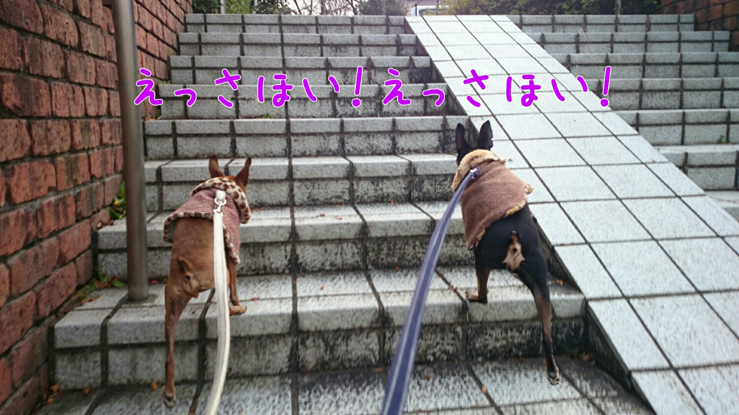ふたり一緒に、元気に階段も